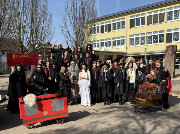 Nach wochenlanger Planung im „Geheimen“ während des Schulalltags war es am Faschingsdienstag endlich soweit: Unsere Umzugsgruppe der Grundschule Herxheim zog mit knapp 35 Personen, darunter fast das ganze Kollegium mit Schulleitung sowie einigen Familienangehörigen, durch die Herxheimer Straßen. Eine große Überraschung für unsere Schülerinnen und Schüler und deren Familien, denn ihnen hatten wir im Voraus nichts verraten. Angelehnt an das Thema Harry Potter und die magische Schule Hogwarts starteten wir unter dem Motto: „Herxwarts – eine zauberhafte Schule“ mit Kofferwägen, einem Musikwagen und einem kleinen „Herxwarts Express“ voller Tatendrang am Dienstagvormittag in den Südring. Dort wurde noch einmal unser Fußgruppentanz geprobt, der Aufstellungsplatz gesucht und sich schon einmal warmgefeiert. Bei bestem Wetter verteilten wir auf unserem Weg durch den Ort nicht nur süße Freuden an alle kleinen und großen Zuschauer, sondern auch begehrte Hausaufgabengutscheine an unsere Schülerinnen und Schüler. Nach einem erfolgreichen Umzug voller Spaß und Tanz konnten wir uns anschließend in der Sonne im Hof unserer Grundschule am mitgebrachten Buffet stärken, bevor es zur Siegerehrung in die Festhalle ging. Ein toller Tag und auch im nächsten Jahr wollen wir wieder dabei sein!