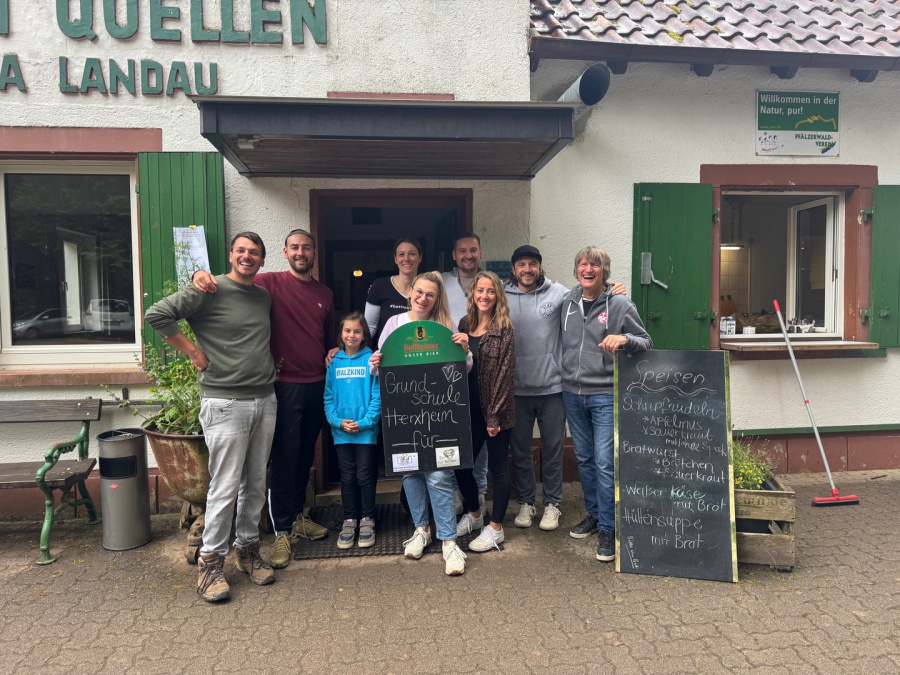Bereits am Samstag reisten einige Kollegen der Grundschule Herxheim auf der Hütte an, um mit viel Liebe und noch mehr Spaß die Vorbereitungen für sonntags zu treffen. Es wurde Gemüse geschnitten, die Küche eingeräumt und viel gelacht. Ein geselliger Abend, der sehr viel Spaß machte und optimal zur Vorbereitung genutzt werden konnte. Am 25. Mai 2025 übernahm dann das Kollegium den Hüttendienst auf der Amicitia-Hütte bei Landau. Ab 11 Uhr strömten bei bestem Ausflugswetter zahlreiche Wanderer, Familien und Radfahrer herbei, um sich kulinarisch verwöhnen zu lassen. Der kurzzeitige Regenschauer am Vormittag tat der Stimmung keinen Abbruch – im Gegenteil: Schon bald waren alle Plätze im Außenbereich belegt, und der Duft von frisch zubereiteten Speisen lag in der Luft. Besonders die herzhaften Schupfnudeln und die cremige Kartoffelsuppe erwiesen sich als Publikumslieblinge und fanden reißenden Absatz. Während die Kinder ausgelassen im Freien spielten, nutzten die Erwachsenen die Gelegenheit zu angeregten Gesprächen bei kühlen Getränken und süßen Leckereien. Das engagierte Hütten-Team sorgte unermüdlich dafür, dass sich alle Gäste willkommen und bestens versorgt fühlten. Neben geselligem Beisammensein stand an diesem Tag auch ein guter Zweck im Mittelpunkt: Die gesamten Einnahmen in Höhe von 500.- € flossen als Spende in die „VOR-TOUR der Hoffnung“ und kommen so anderen Kindern in Not zugute. Ein herzliches Dankeschön geht an alle Besucher, die mit ihrem Kommen und Genießen diese Aktion unterstützt haben.